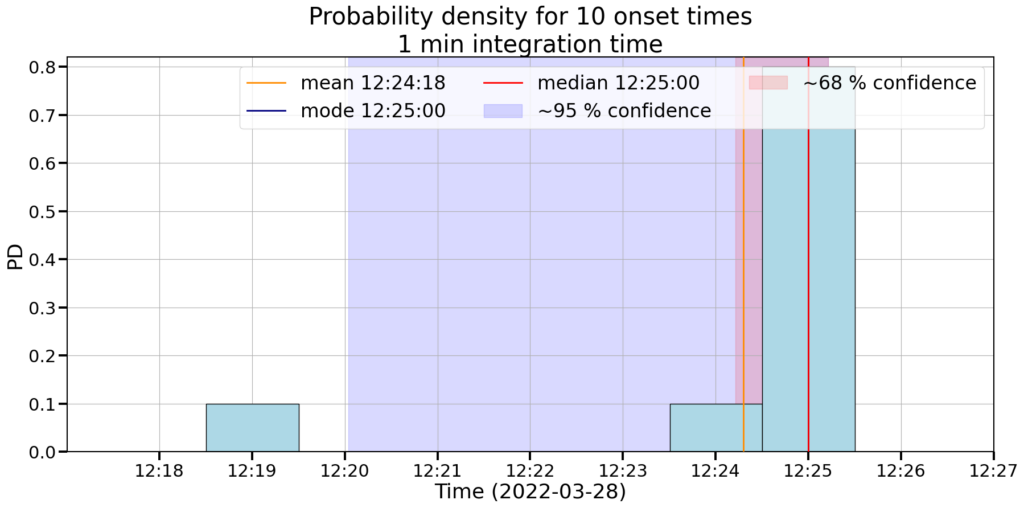 PyOnset will then determine the most probable onset time (see Fig. 2) using a novel hybrid method that employs a modified version of the Poisson-CUSUM scheme and statistical bootstrapping to find distributions of possible onset times, with additional methodological time-averaging to smooth out potential noise in the data. As auxiliary plots, one can produce, for example, a histogram of the onset time distribution (Fig. 3). These plots showcase the steps of how the software determines the most likely onset time for the event.